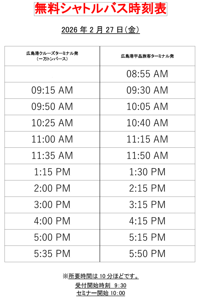 明日2月27日(金)に開催される『2025年度 広島港行ってみんさいクルーズへ!』に係るシャトルバスのご案内です。時刻表及び乗降場所をご確認いただき、ご都合に合わせてご利用ください。